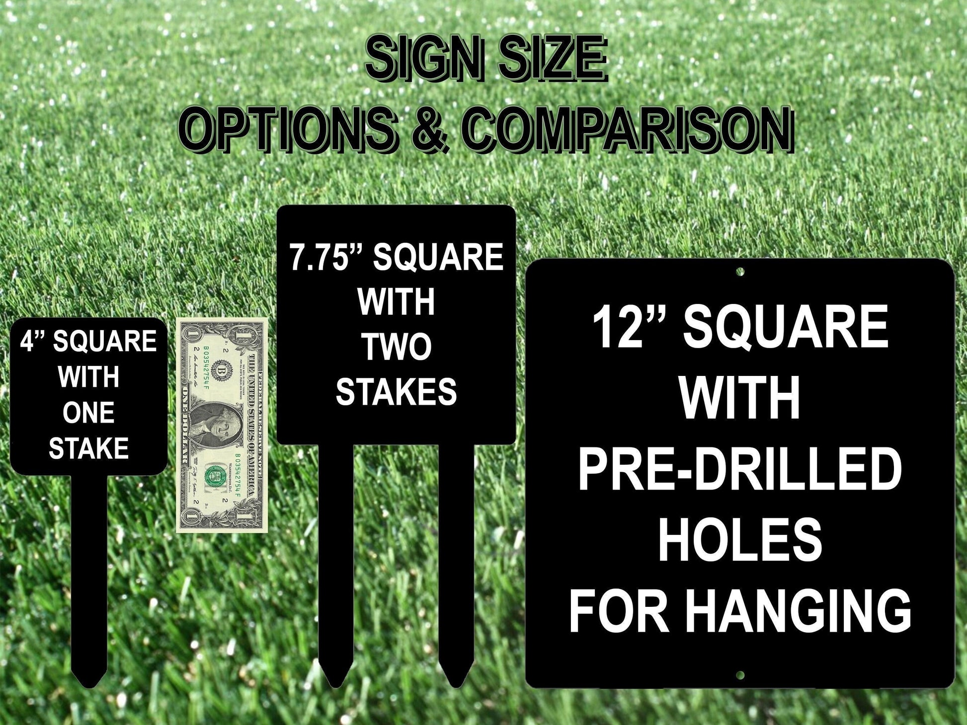 • The 4” sign, including its stake, measures about 4” x 10”, while the larger 7.75” sign, with two stakes, measures approximately 7.75” x 15”. Both are 0.04” thick.