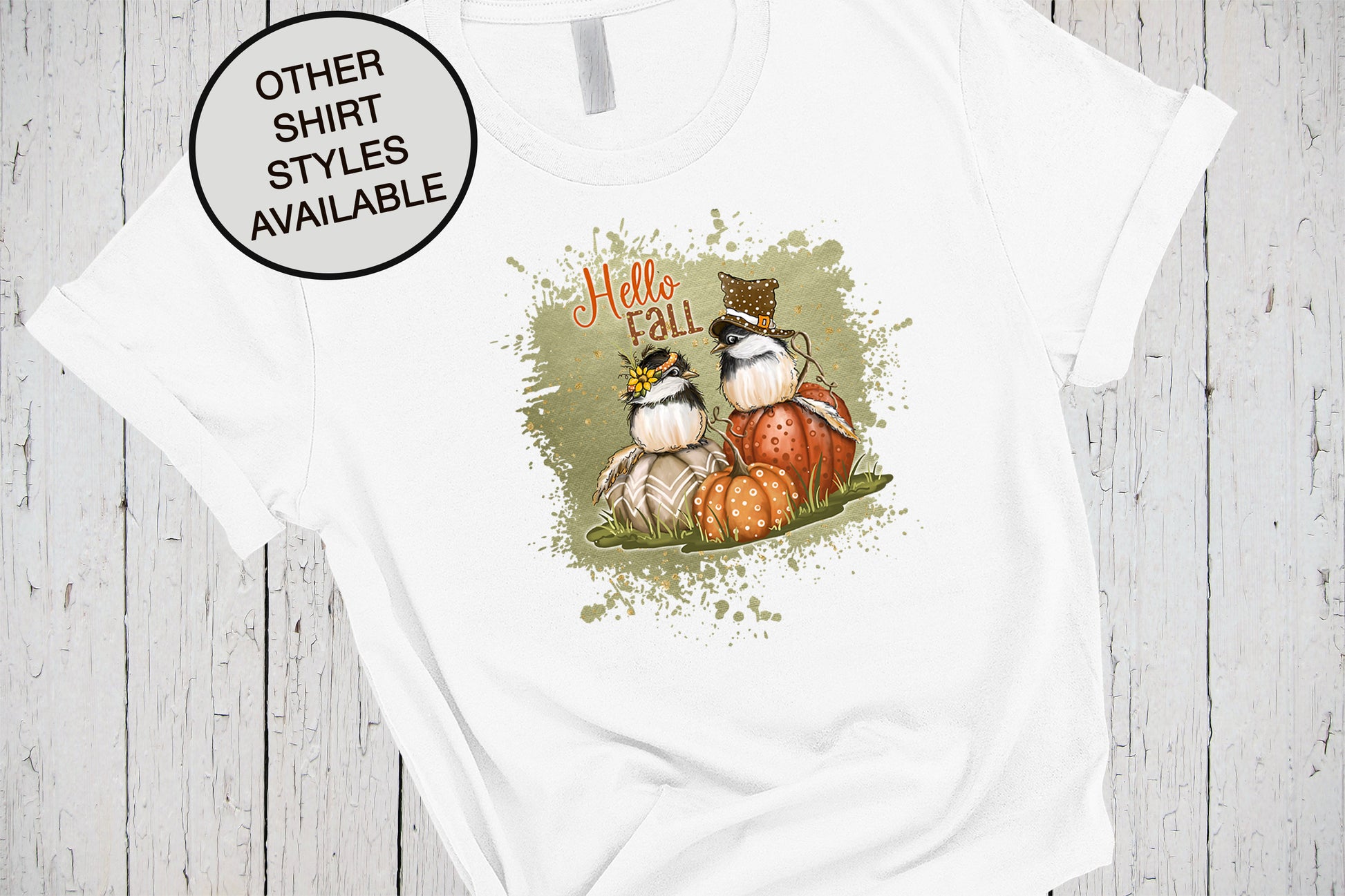 Hello Fall, Trendy Fall Shirt, Friendsgiving Shirt, Womens Fall Tshirt, Chickadee Gift, Bird Lover, Thanksgiving Shirt, Fall Pumpkin Shirt,